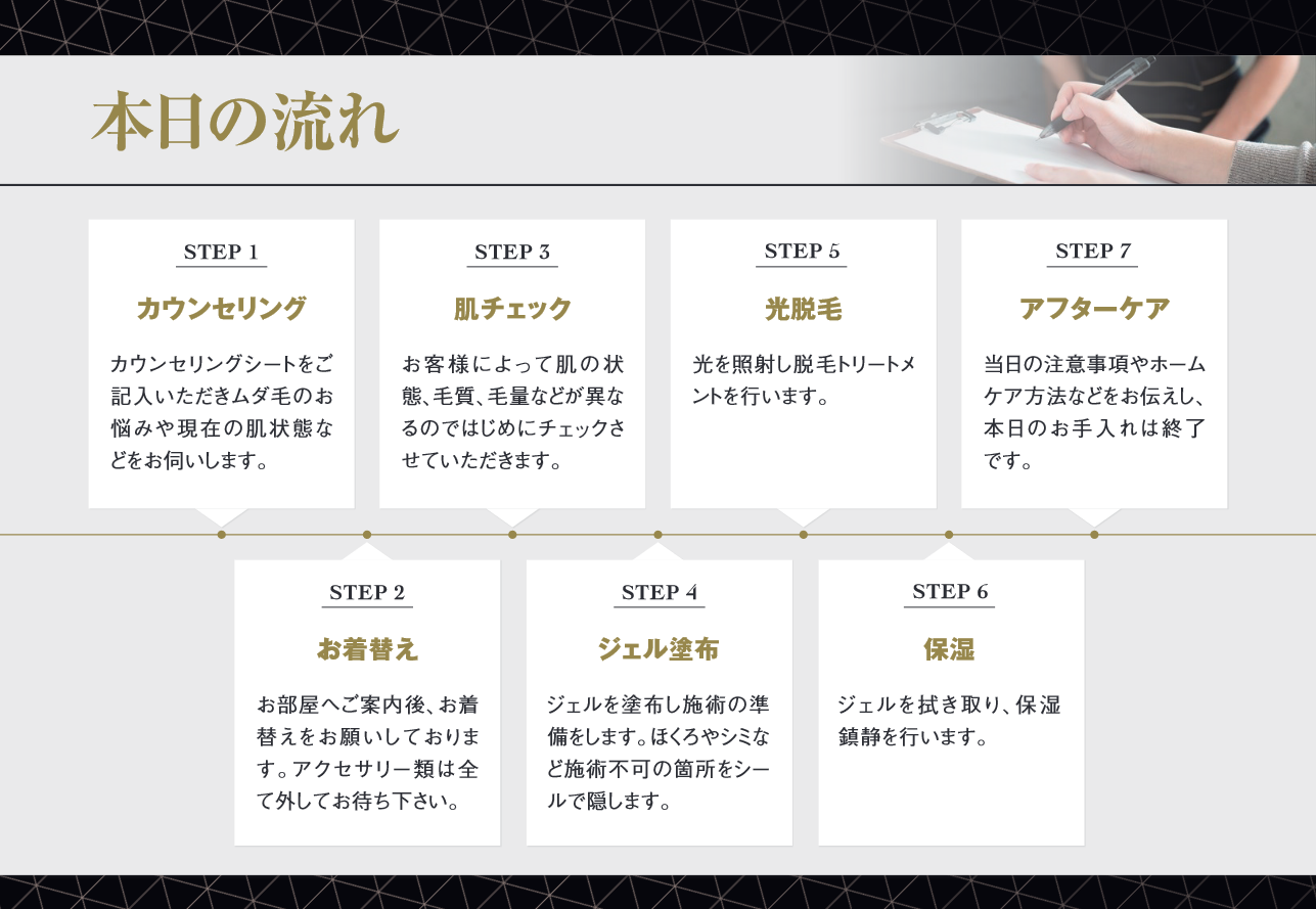 初めての方でも安心していただけるように、カウンセリングでは毛質・肌質・ライフスタイルをしっかりと確認し、最適なプランをご提案いたします。